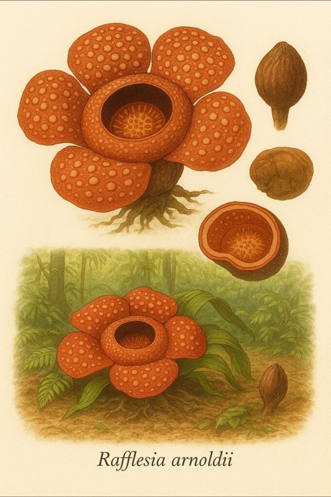 Ciclo de Vida: El crecimiento del capullo parasitario puede durar de 9 meses a 3 años, pero la floración real solo dura entre 5 y 7 días antes de que la flor comience a descomponerse. Por su tamaño descomunal y su forma circular, muchos la describen como una flor alienígena gigante. Aquí puedes ver más información detallada de 👉 Rafflesia Arnoldii