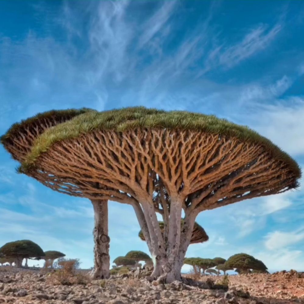 Su savia roja, conocida como “sangre de dragón”, ha sido usada desde la antigüedad como tinte, medicina y resina sagrada. Este árbol parece desafiar las leyes del paisaje, creciendo en uno de los lugares más áridos y aislados del planeta. Su forma surrealista y su color rojo intenso lo convierten en una de las plantas más fantásticas del mundo.