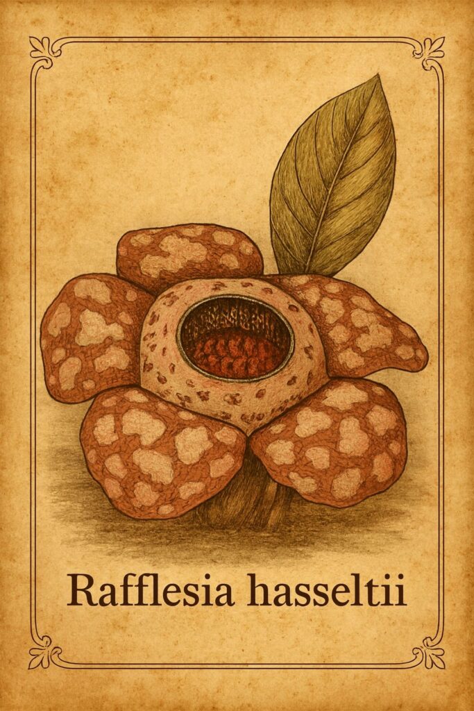 La Rafflesia hasseltii pertenece al pequeño grupo de plantas parásitas más llamativas de la Tierra. Es conocida por sus enormes pétalos carnosos de tonos rojizos y su patrón moteado, que la hace inconfundible. Pero su fama no se debe solo a su aspecto: