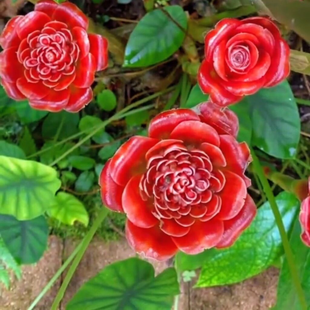 Brácteas: La estructura principal y más visible está compuesta por brácteas modificadas que se asemejan a pétalos de cera de color rojo o rosado, dándole la apariencia de una rosa (de ahí su nombre común “Rosa de Siam”). Estas brácteas son prominentes y estériles (no dan lugar a flores).