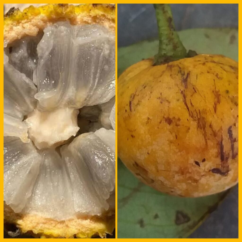 Cáscara: La cáscara es delgada y se describe como fácil de pelar o que “se agrieta al presionarla con el dedo” cuando está completamente madura, exponiendo la pulpa. El color de la cáscara puede ser amarillo-naranja.