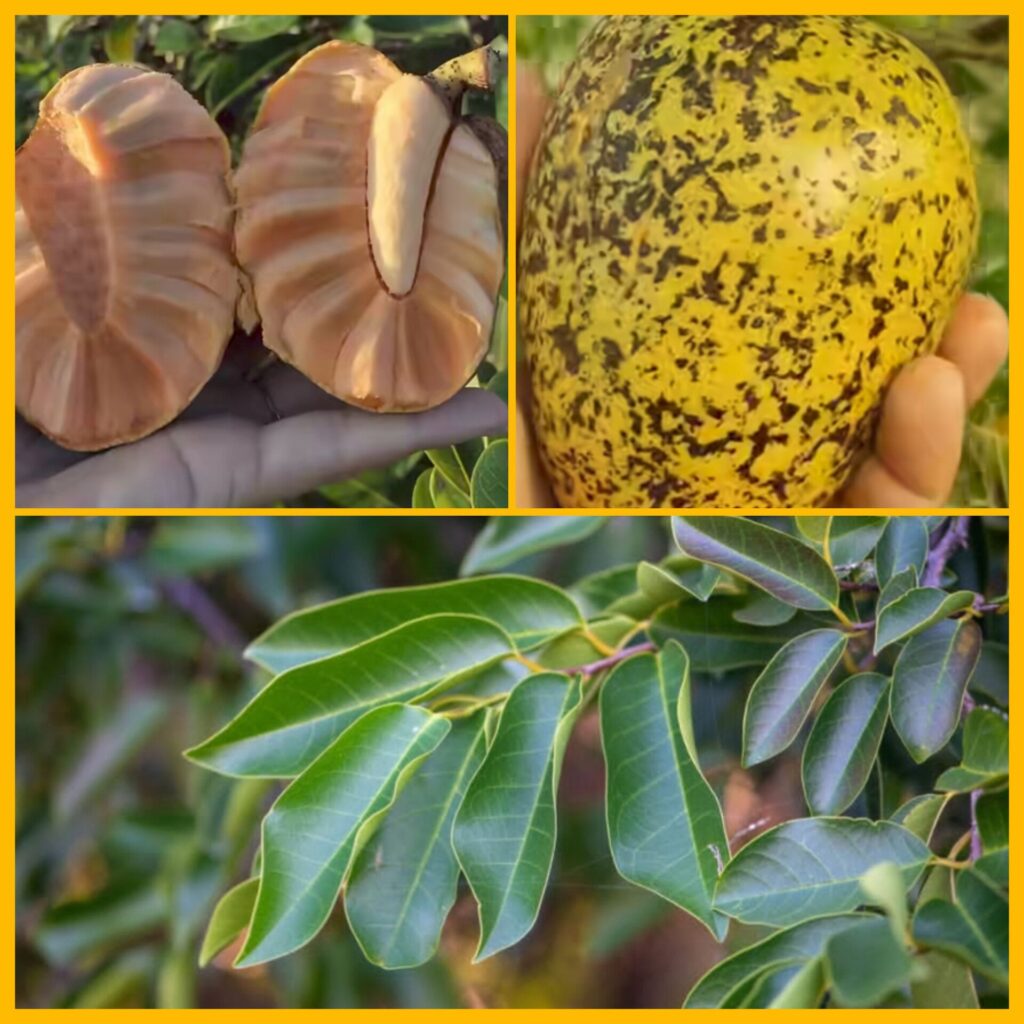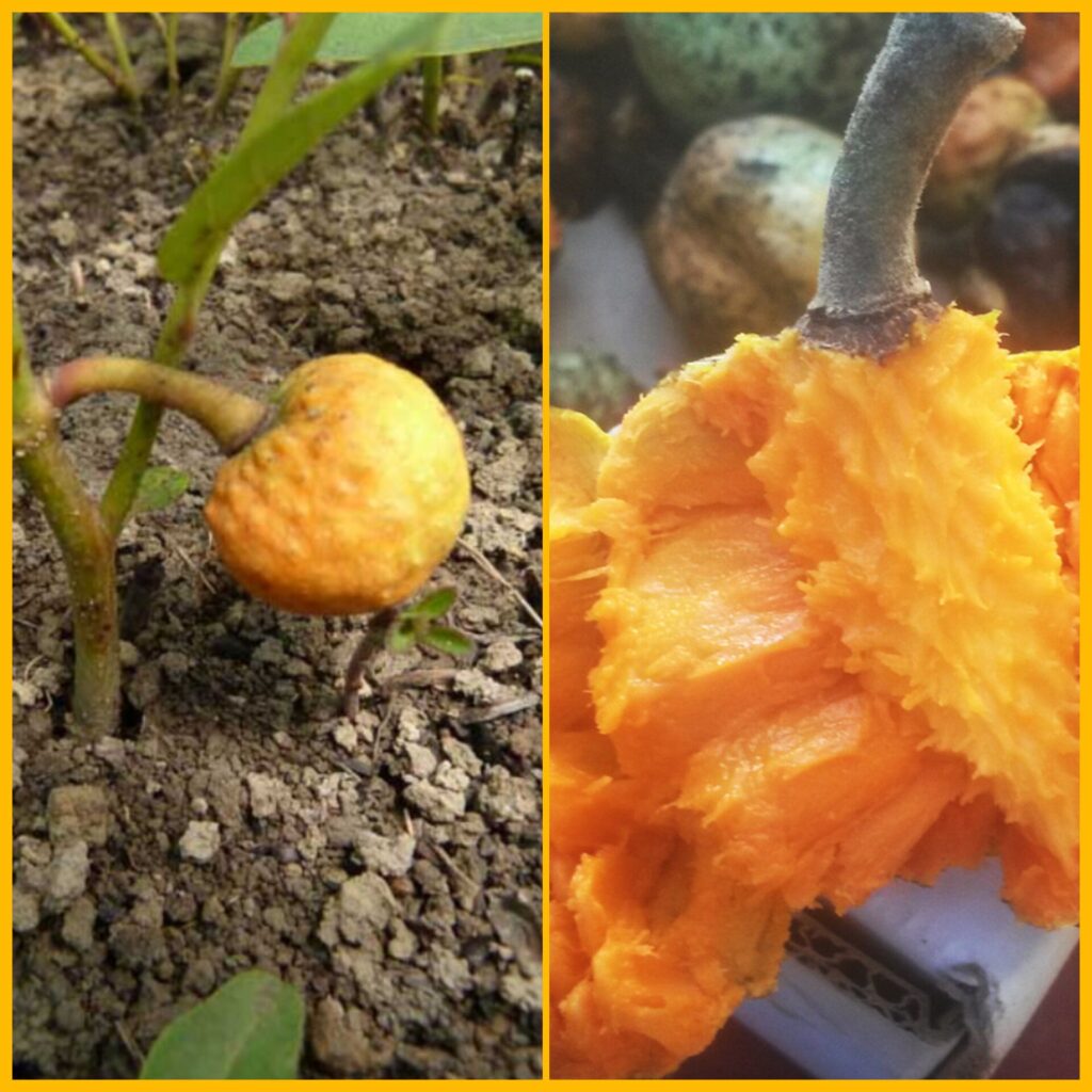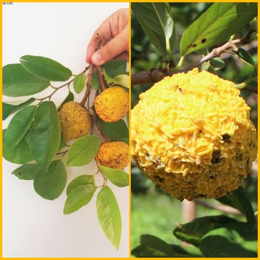Fruto: Es un fruto tipo baya, de color amarillo dorado a naranja al madurar, con una cáscara rugosa e irregular.
