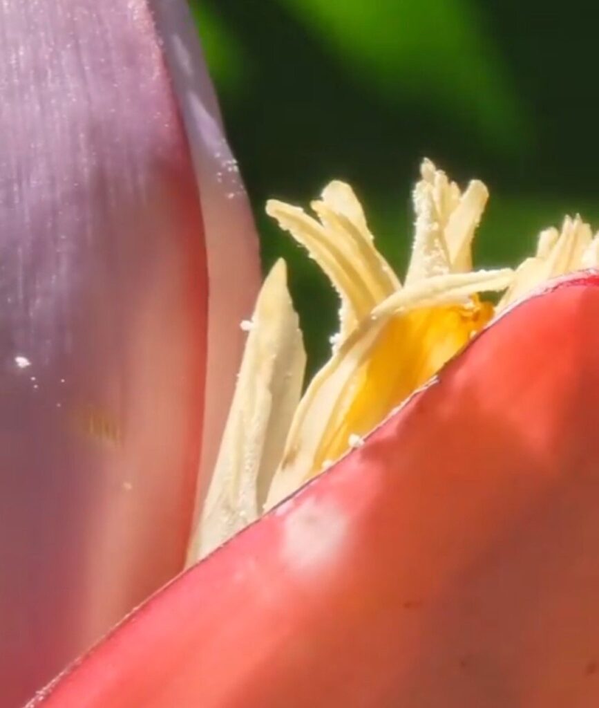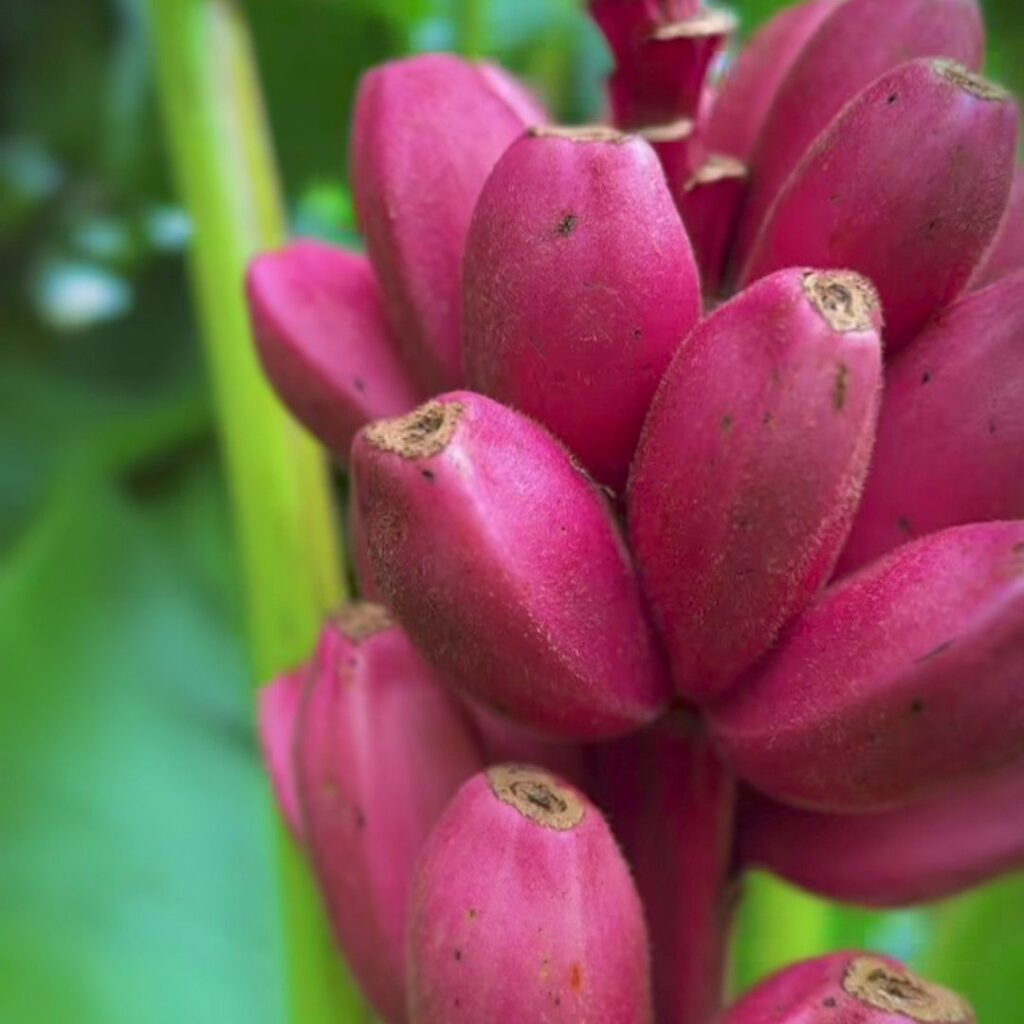 Color y Textura: Son de un color rosa intenso o escarlata y tienen una textura peluda o aterciopelada (cubierta de pelos muy finos) cuando son jóvenes, de ahí su nombre común “Plátano Peludo”.