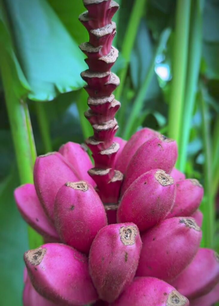 “Siempre Rosa”: A diferencia de otros plátanos que desarrollan colores solo al madurar, los frutos de la Musa velutina comienzan a formarse con un color rosa o escarlata brillante que mantienen durante todo el proceso de maduración. Esta característica es la razón principal de su popularidad ornamental.