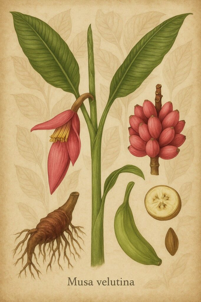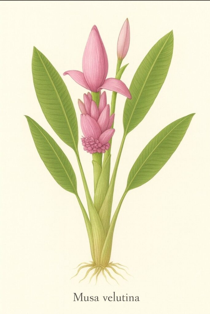 La Musa velutina, o Plátano Rosa Enano, es una especie que guarda varias peculiaridades que la distinguen de sus primos comestibles y la hacen un tema de interés tanto para botánicos como para jardineros: